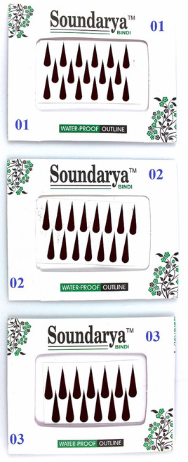 "Simran" water proof Kumkum tilak bindis. Available in 3 sizes. Please select by choosing the number in the picture. The biggest one is 1.5 cm long and the smallest one is 1 cm long. Suitable for party and casual wear.