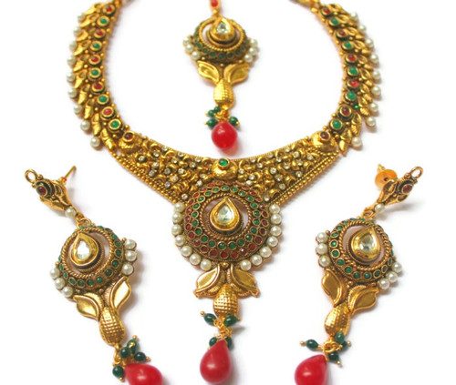 A gorgeous full set of necklace,earrings & a maang tika,perfect for all functions. The set is made of long lasting copper alloy with 1 gm gold plating.
